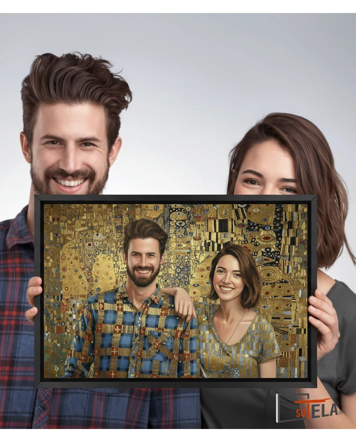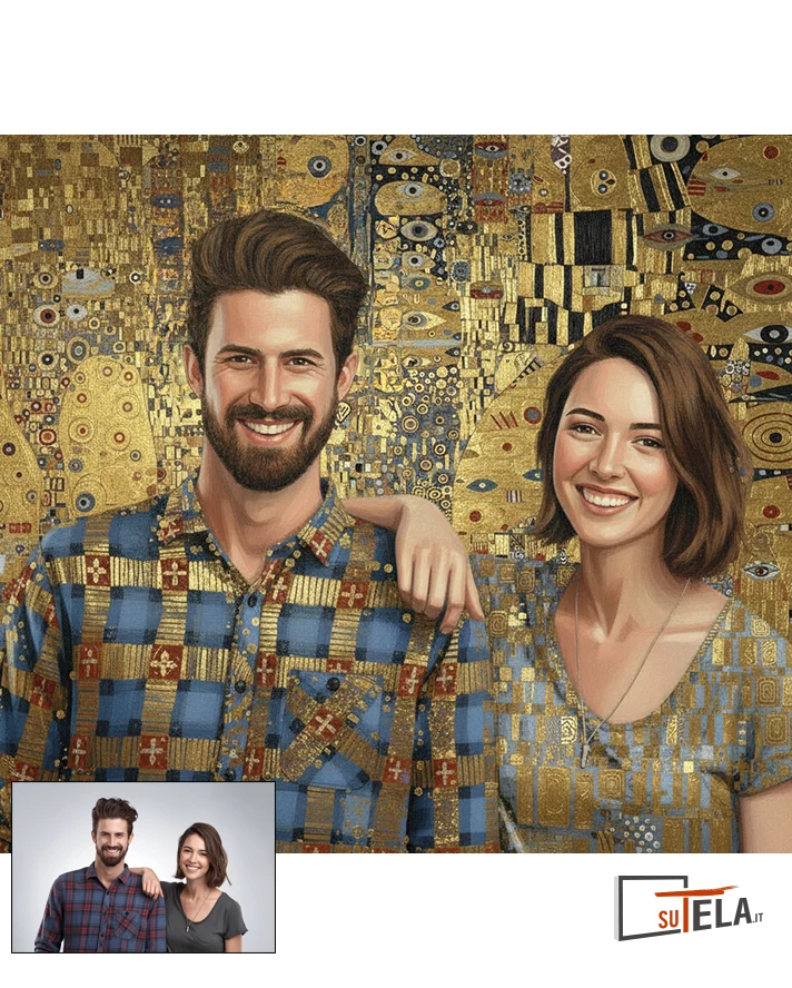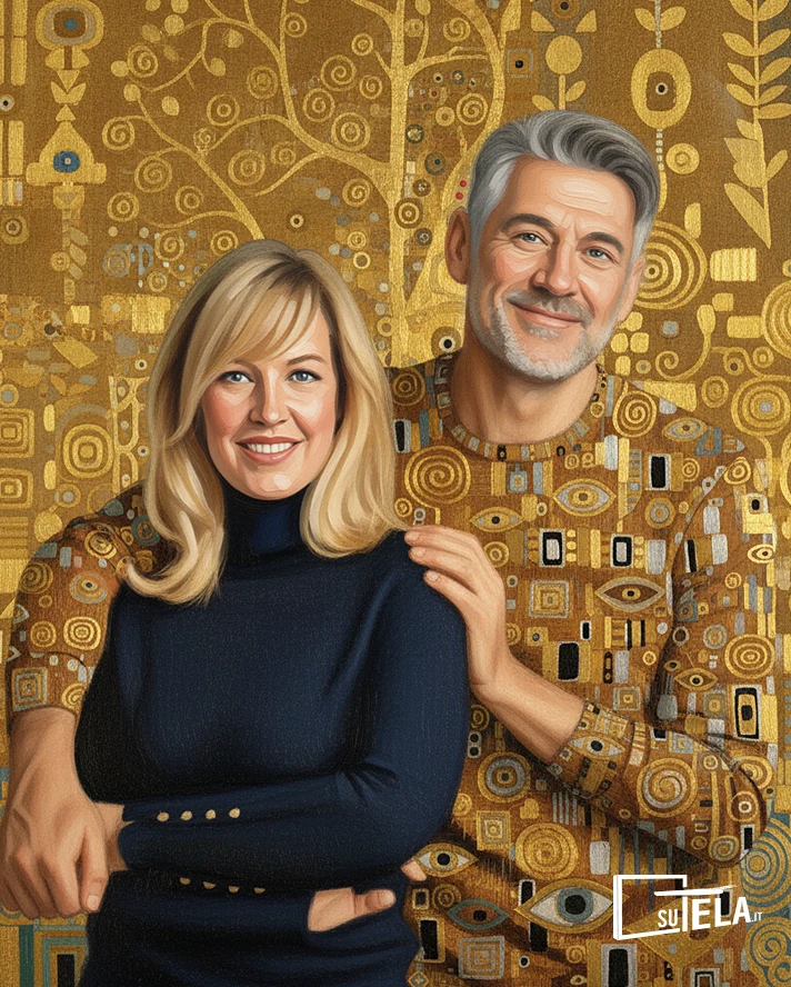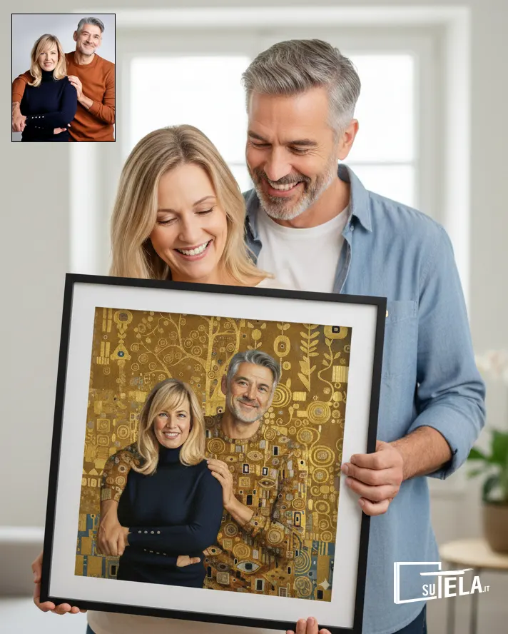 Immagina di regalare ai tuoi genitori per il loro anniversario un ritratto che li immortala nella stessa aura dorata de “Il Bacio” di Klimt. Un ritratto personalizzato in questo stile trasforma l’amore quotidiano in mito eterno, creando un cimelio di famiglia che verrà tramandato per generazioni.